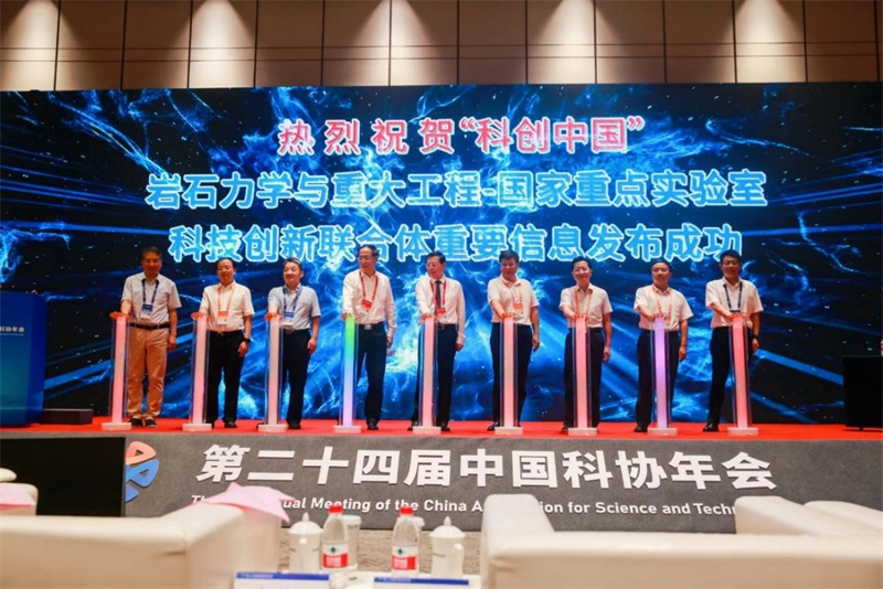 在重要信息发布环节,何满潮院士介绍了"科创中国"岩石力学与重大工程-国家重点实验室科技创新联合体、岩土力学与工程地质领域高质量科技期刊分级目录和"面向地震预测的跨断层测量"国际对比研究计划三项重要信息发布内容,与会嘉宾先后启动发布按钮,庆祝三项重大信息发布成功。