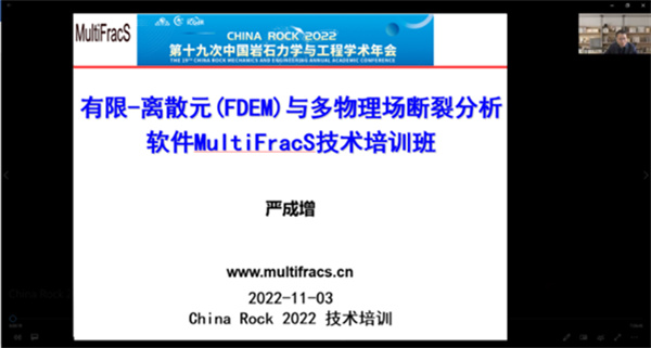 2022年11月3日,在ChinaRock2022 第十九次中国岩石力学与工程学术年会期间,首届FDEM多物理场断裂分析软件MultiFracS培训班召开,本场技术培训由中国岩石力学与工程学会青年工作委员会和中国岩石力学与工程学会岩体数学物理模拟专业委员会联合主办。此次培训采用线上方式举办。国家杰青郑宏教授为首届MultiFracS培训班致欢迎辞。