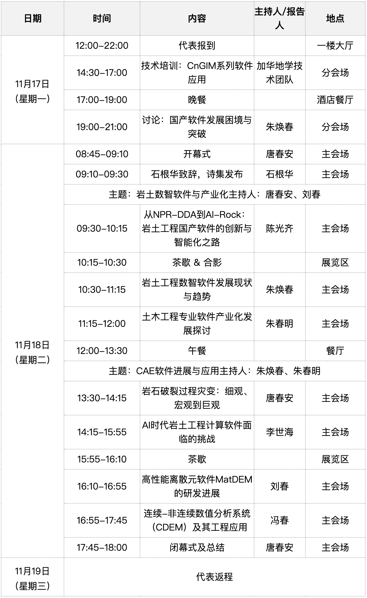为深入贯彻国家创新驱动发展战略,加快落实工业软件自主可控部署,响应 2027 年工业软件更新升级总体要求,加强我国岩土工程领域国产软件核心技术自主研发,推动技术转化与成果应用,由中国岩石力学与工程学会主办、中国岩石力学与工程学会国际交流工作委员会、中国岩石力学与工程学会地质工程技术工作委员会及武汉岩土工程学会承办的“第五届岩土工程国产软件发展 论坛”,拟于 2025年11月17——18日在湖北省武汉市举行。