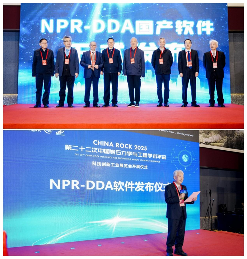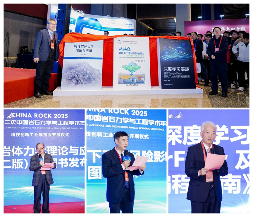 著名科学家顾金才、康红普、何川、朱合华、陈光齐、Andrian Batugin等莅临活动现场,展商代表、参会代表及观展群众300余人齐聚一堂,现场气氛热烈。开展仪式由学会国际事务秘书处副秘书长,西南石油大学马天寿和北京科技大学冯献慧主持。 开展仪式上,隆重发布了NPR-DDA国产软件,顾金才、何满潮、康红普、何川、朱合华、陈光齐、Andrian Batugin、Alexandre Pinto共同为软件发布揭幕。NPR-DDA软件的发布,标志着我国在非连续大变形分析领域取得了核心技术的重大突破,具有里程碑式的跨时代意义。 为纪念中国岩石力学与工程学会成立40周年,学会组织编写版了《中国岩石力学与工程40年成就》,副主编康红普院士介绍了本书编撰的背景和意义,该书全面梳理了我国岩石力学理论、技术、材料和工程应用的历史脉络与创新跨越,展示了我国岩石力学领域在国产软件与高端装备方面的最新进展和突破,为推动我国岩石力学与工程学科发展起到的积极作用。顾金才院士、何满潮院士共同为新书揭幕。 《古河道对地下工事风险影响研究》《统计岩体力学理论与应用》《深度学习实践——基于TensorFlow及PyTorch库的编程指南》三部新书也正式发布。