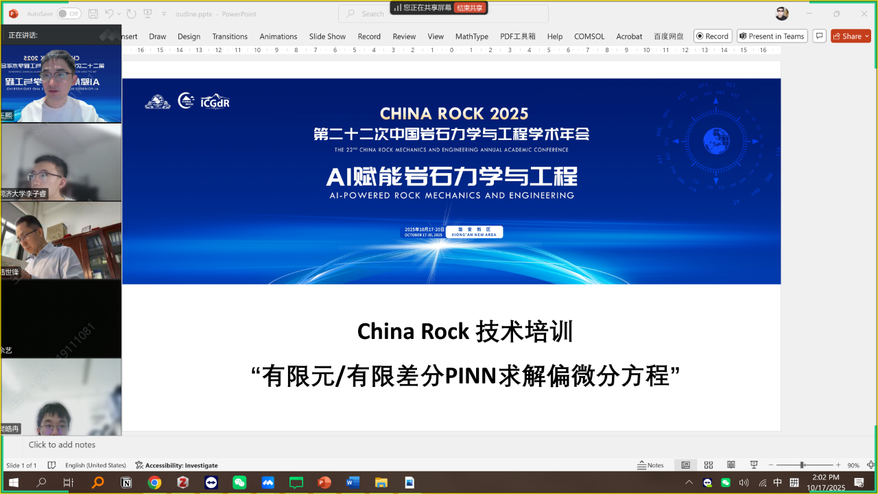 2025年10月17日,在China Rock 2025 第二十二次中国岩石力学与工程学术年会期间,由中国岩石力学与工程学会和国际地质灾害与减灾协会共同主办、岩土工程信息技术与应用分会、AI实用化专业委员会、DDA专业委员会联合承办的“有限元/有限差分PINN求解偏微分方程培训班”在雄安线上成功举办。培训吸引了来自清华大学、中国科学院、同济大学、山东大学、东南大学、中南大学、西安交通大学、大连理工大学、中国石油大学、北京理工大学、青海大学、重庆交通大学、西安科技大学、沈阳建筑大学、山东科技大学、华北水利水电大学、石河子大学、上海同岩土木工程科技股份有限公司、中交第三航务工程勘察设计院等20家高校、科研院所及企业的学员。