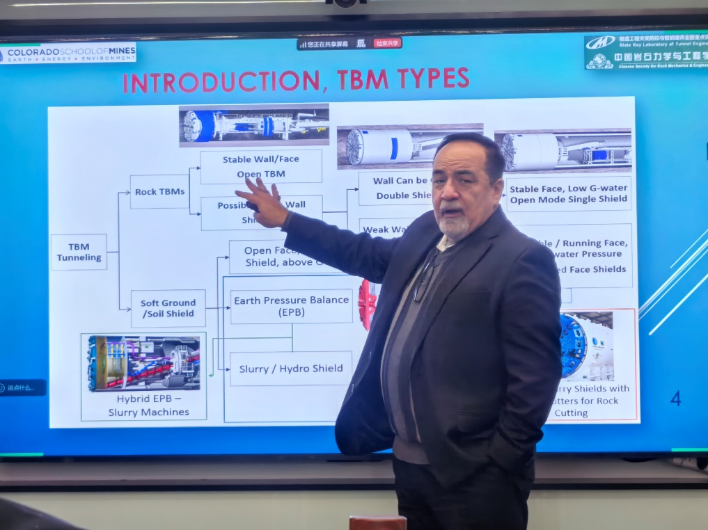 Rostami教授围绕隧道掘进机(TBM)工程实践中的关键问题,作了两场紧密关联的专题报告:“岩石隧道掘进机(TBM)性能预测” 与 “TBM利用率估算的挑战”。他系统阐释了影响TBM掘进效率的关键地质与机械参数,分享了基于工程数据的性能预测模型构建方法;深入分析了TBM利用率的关键影响因素,并系统介绍了传统估算模型的局限性和未来智能预测的发展趋势。两场报告从理论建模延伸到工程管理,为TBM项目的科学规划与高效实施提供了完整的技术框架。