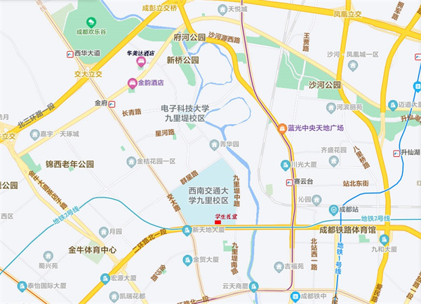 成都金韵酒店、华美达酒店和交大学生礼堂交通简图