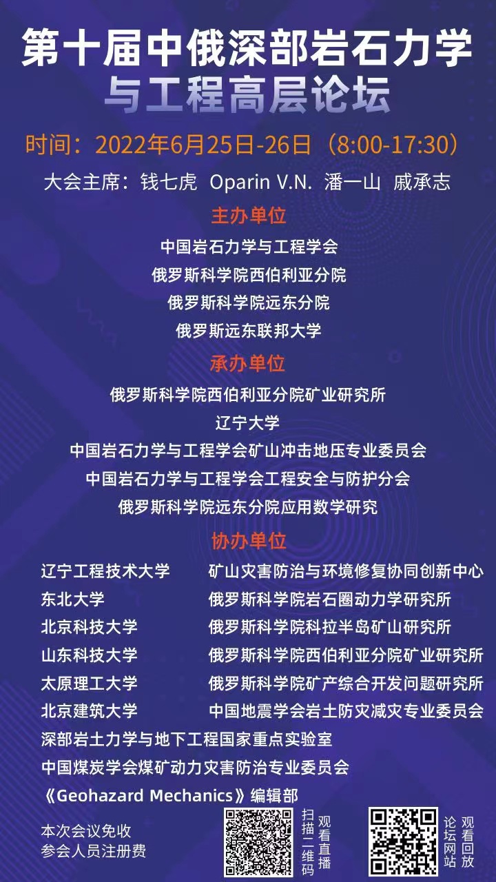 论坛形式:线上 (扫描二维码,观看直播) 第十届中俄深部岩石力学与工程高层论坛网址:https://www.cnruprf.com/