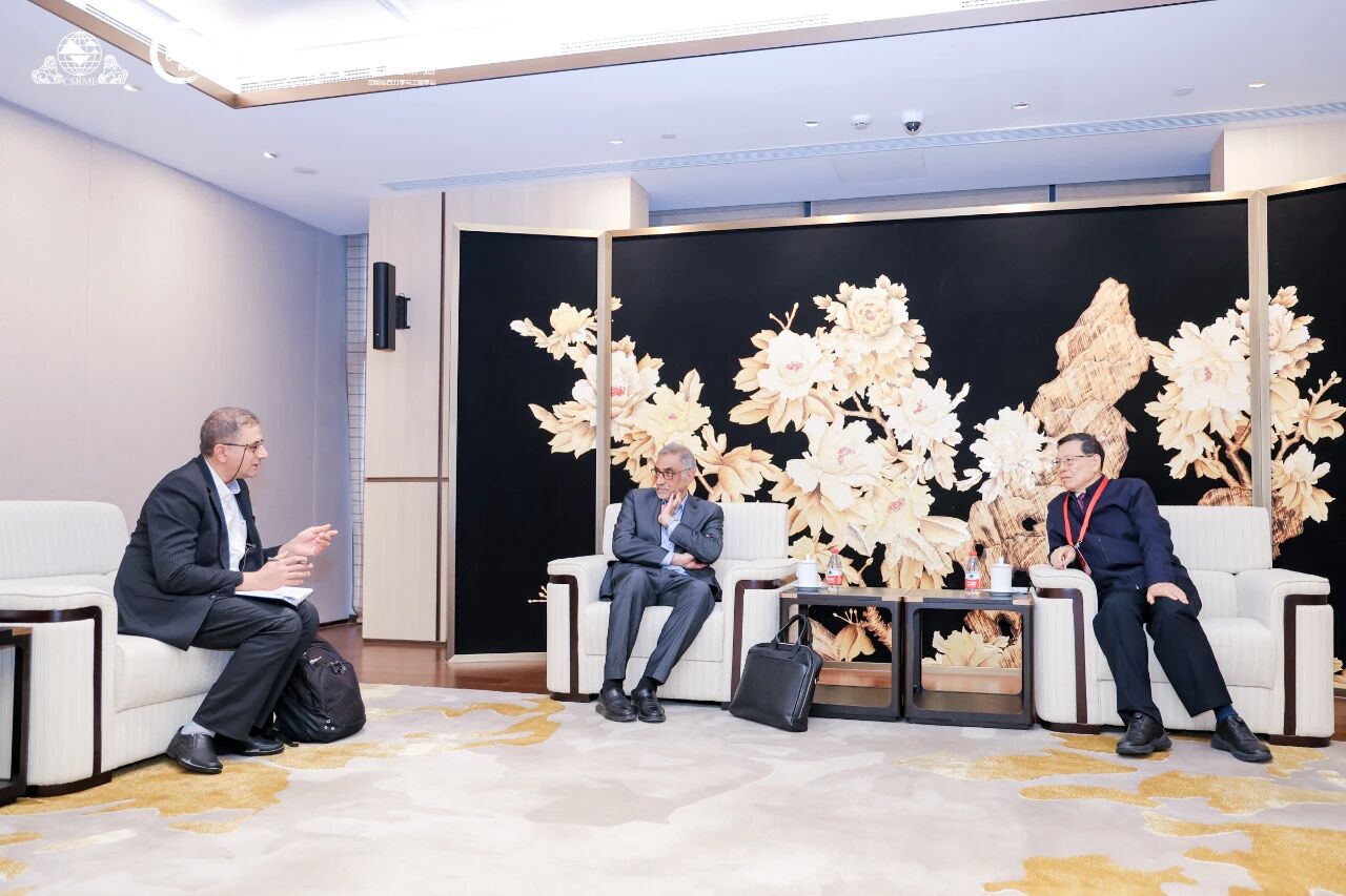10月18日下午,理事长何满潮院士首先会见了伊朗伊斯法罕理工大学校长Seyyed Foroushani率领的代表团一行3人。双方重点围绕地震预测科学研究与技术应用进行了深入探讨。伊方详细介绍了伊朗特殊地质构造条件下面临的地震频发挑战,表达了提升地震监测预警与防灾减灾能力方面的迫切需求;何院士分享了中国在地震预测领域的最新研究成果,包括监测技术、设备与关键材料方面的前沿进展。基于在需求与技术上的高度互补性,双方就推动基础研究合作达成多项共识,包括:联合申报国际重大科研项目、共建“中-伊地震工程联合实验室”、定期举办双边学术研讨会、签署合作备忘录等。这标志着中-伊在地震科学领域的科技合作迈出实质性步伐。
