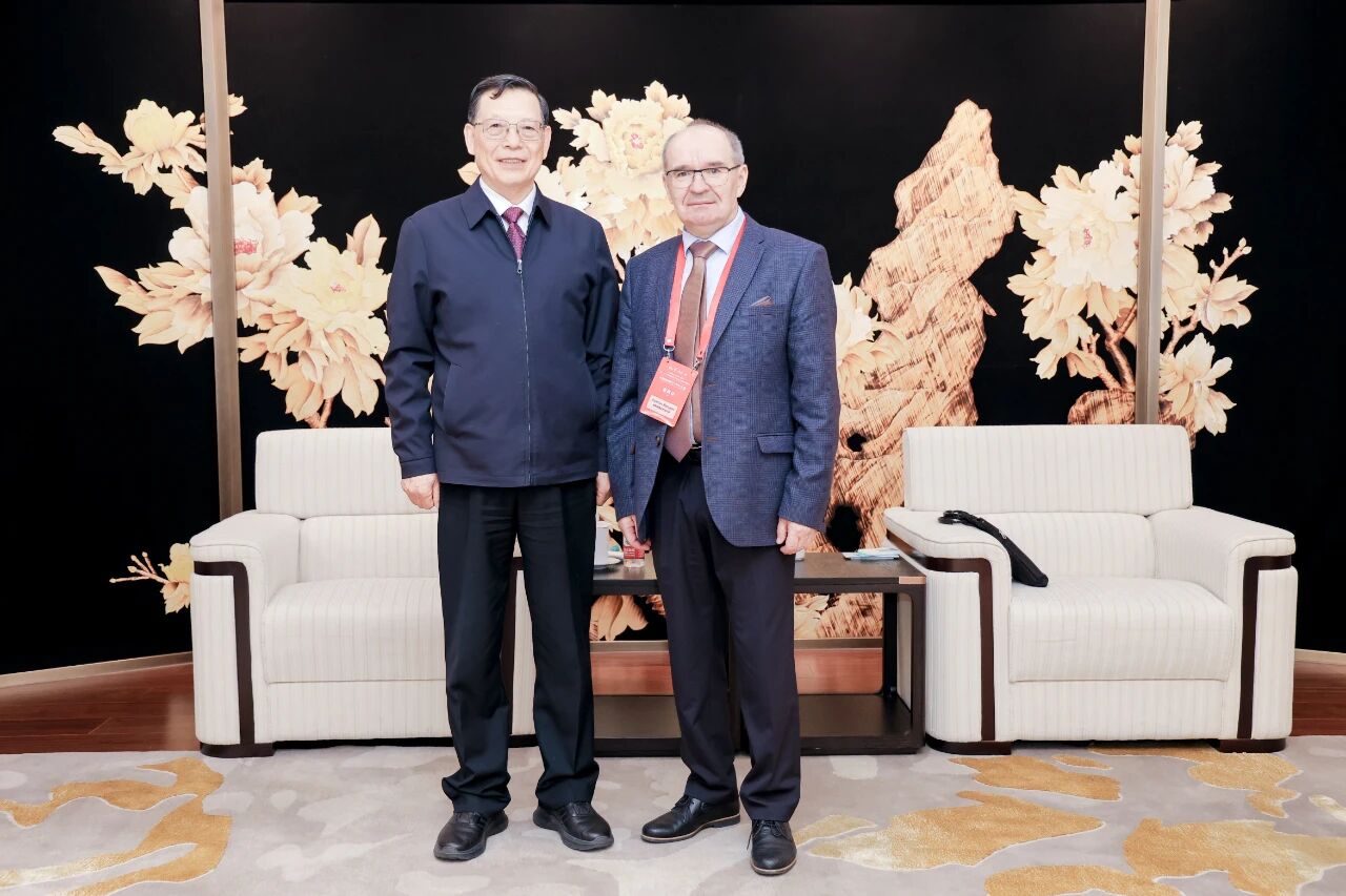 在与俄罗斯莫斯科国立大学的Andrian Batugin院士的会见中,何满潮院士首先高度赞赏了Batugin院士的母亲对中国做出的卓越贡献,回顾了Batugin院士几十年来孜孜不倦对中国的付出。双方就岩石力学与工程领域前沿科技、未来共同举办学术研讨会、联合培养博士生等达成了共识。