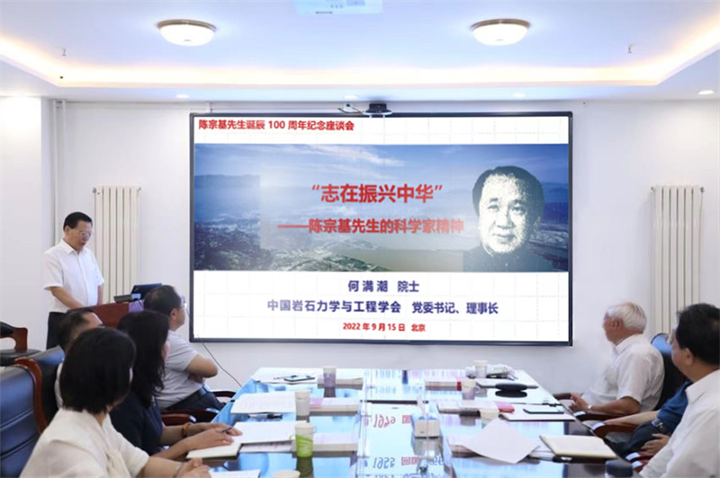 2022年9月15日,是中国岩石力学与工程学会创始人陈宗基先生诞辰一百周年,为缅怀纪念和宣传学习陈宗基先生舍家为国、矢志不渝的爱国精神和慎思明辨、笃行致远的科研精神,响应全国科学道德和学风建设宣传月活动号召,中国岩石力学与工程学会隆重举办“陈宗基先生诞辰100周年纪念座谈会”。中国科协党组副书记徐延豪,中国科协学会服务中心有关负责同志出席指导。孙钧院士、钱七虎院士、陈祖煜院士等学会历届理事长及老同志代表出席会议。何满潮院士、冯夏庭院士、李术才院士、赵阳升院士、康红普院士、杨春和院士、朱合华院士、王明洋院士等学会“3+1”领导班子成员、学会秘书处专兼职全体成员及《岩石力学与工程学报》编辑部全体成员等60余人参加会议。大家齐聚一堂,共同追忆缅怀陈宗基先生的爱国事迹、科学精神和崇高风范。会议由学会党委书记、理事长何满潮院士主持。