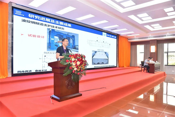 同济大学丁文其教授作了题为“隧道新型波纹钢支护力学性态试验及分析方法研究与新应用”的报告,介绍了波纹钢隧道支护技术、波纹钢棚洞隧道技术和波纹钢-混凝土复合结构电加热试验系统与技术,认为研发具有国际领先水平的高强柔性抗腐蚀新型不锈钢材料及其预制波纹状拼装板成型工艺,将大力推进钢结构在隧道及地下工程中的发展应用,实现材料及工艺的双重革新。