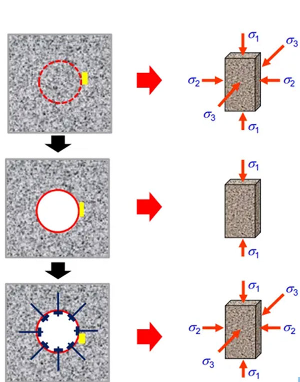 隧道工程是地质历史的画卷,钻头的改进凸显了人力工程的智慧。其中涉及的关键科学技术是隧道开挖补偿法。该方法可以总结为三个原理:首先,所有的破坏均由开挖引起;其次,开挖会产生三个效应,分别为三轴状态变为单轴状态、径向应力为零、切向应力集中;最后,由于破坏发生在开挖一段时间之后,因此需要在没有产生破坏的时间内实施补偿措施,迅速消除三个开挖效应,充分发挥围岩的三轴强度和调动深部围岩强度,有效控制破坏,达到工程稳定状态。