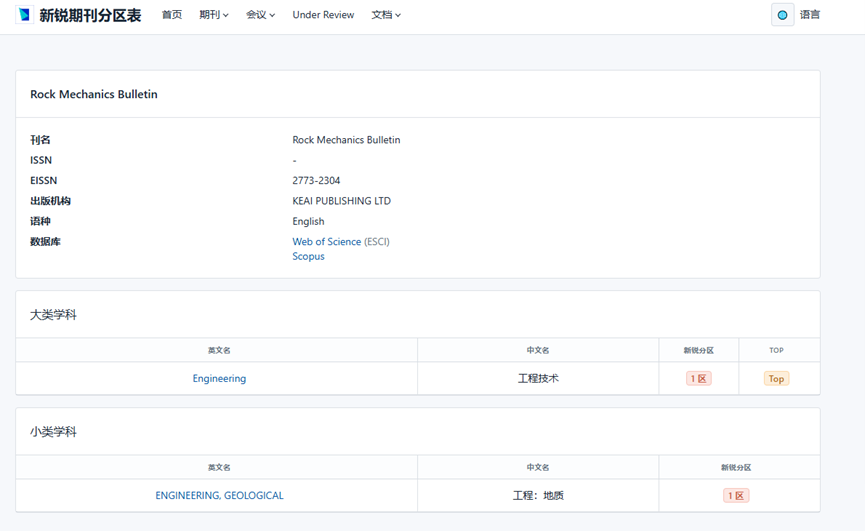 Rock Mechanics Bulletin 入选中科院期刊分区表(新锐分区)1区TOP