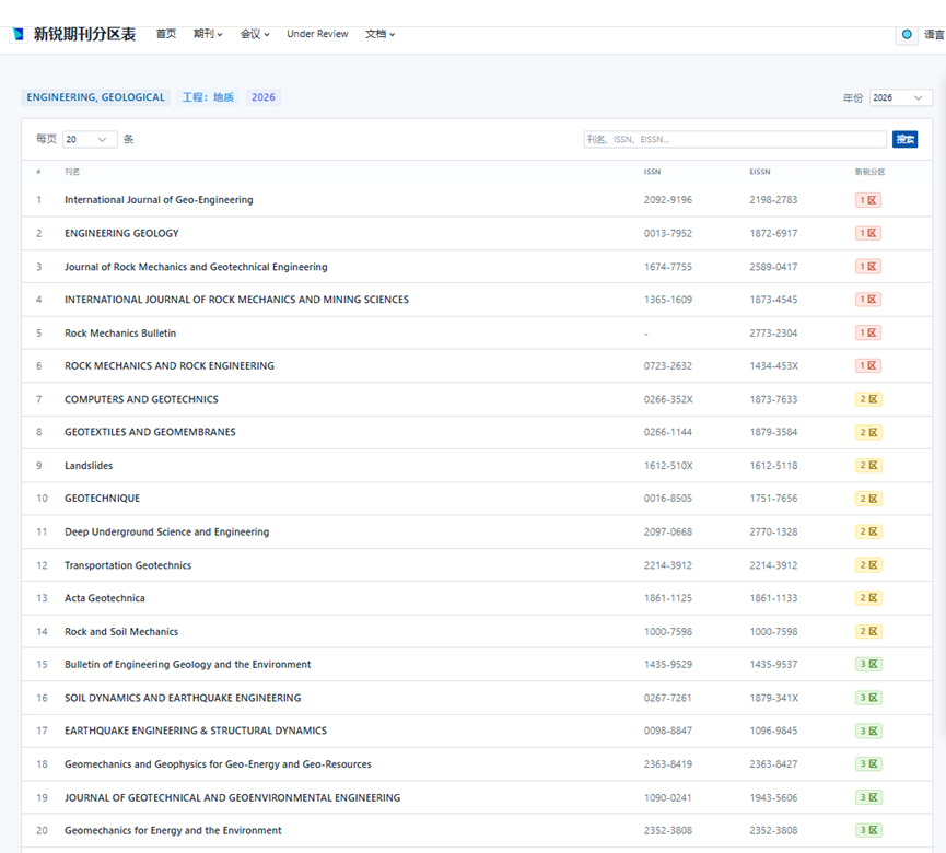 近日,《新锐期刊分区表》(简称“新锐分区”)2026年正式发布。我学会主办的岩石力学通报(英文)(Rock Mechanics Bulletin,简称 RockMB)进入“工程技术”大类 1 区TOP,进入“工程:地质”小类1区,实现了期刊发展历程中里程碑式的重要突破。这是继 RockMB 获得首个影响因子7.0,进入 JCR Q1 区TOP 期刊后,取得的又一标志性成果,体现了期刊的学术影响力与核心竞争力的显著提升。