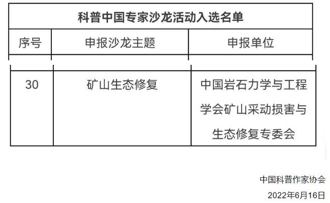 日前,由中国岩石力学与工程学会矿山采动损害与生态修复专委会申报的"矿山生态修复"主题论坛成功入选2022年度科普中国专家沙龙活动。2022年度科普中国专家沙龙活动是由中国科普作家协会于2022年5月13日发起的,全国共有30场活动入选。