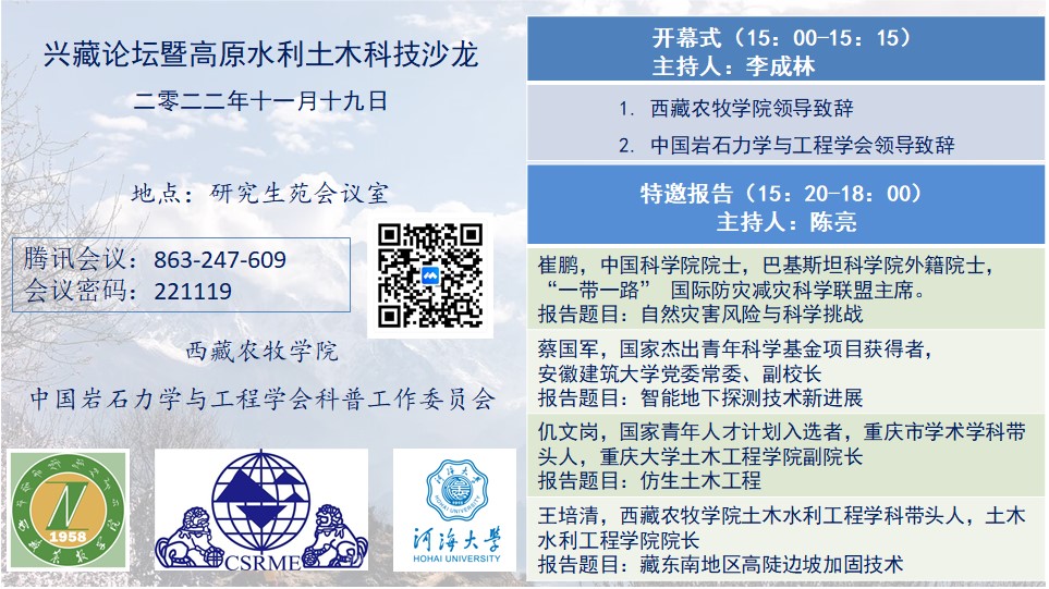 2022年11月19日,为了深入学习贯彻习近平总书记在西藏视察时重要讲话重要指示精神以及党中央的科教兴国战略,推动高原水利土木学科发展,提升藏区学术交流,促进科技创新和科学普及,助力藏区人才培养。在中国岩石力学与工程学会科普工作委员会副主任委员陈亮教授的组织协调下,由西藏农牧学院与中国岩石力学与工程学会科普工作委员会共同组织召开了本期兴藏论坛暨高原水利土木科技沙龙,会议采用线上线下混合方式进行。