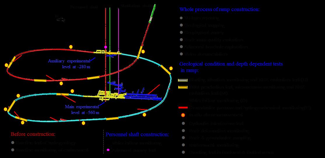 The excavation of the personnel shaft and the ramp of the Beishan URL started in June 2022. A comprehensive field-testing programme focusing on site characterization, technology development and testing will be performed during URL construction, including geological mapping, geophysical surveying hydrogeological investigations, rock suitability evaluation, TBM penetration test, in-situ stress measurements and excavation damage zone (EDZ) characterization, etc. The test locations along the ramp are presented in Fig. 5. In parallel with the above activities, equipment to be used in the URL operation stage will be developed in surface laboratories and then tested in the two experiment levels, e.g., excavation equipment for the deposition hole, installation equipment for the buffer material, and equipment for radionuclide migration testing.