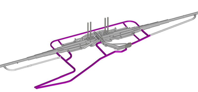 The Station uses the close-cut method, with eight subchannels set for construction at the No. 2 inclined shaft. The cavern construction is organized by the principles of "paralleled and staggered arrangement" and "lower layers and marginal sections first" to ensure safety. For vertical air shafts, a raise borer drills a pilot hole from the surface down, then a drill boresfrom bottom up for the first expansion, followed by the drill and blast method to expand the shaft again from the surface down.The inclined entrance and exit passagesarecompleted with the "4 layers and 8 sections" method, surface-down excavation in four layers and the bottom-up lining in three runs. During the construction of the Station and the large-span station-tunnel transition , new technologiesincludingpre-stressed anchor cable support, DFHZexcavation, super and variable section tunnel second lining, long-life concrete construction, three separate closely-spaced tunnels, three-arch tunnel construction, ventilation for complex underground caverns, are used to solve the various technological challenges encountered.
