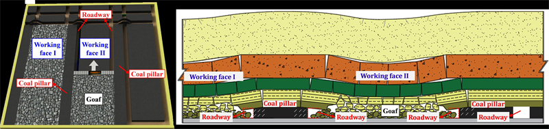 The traditional 121 mining method of longwall mining originated in England, which is widely used around the world. The method requires the excavation of two mining roadways and the reservation of one coal pillar to mine one working face. The degree of roadway excavation is considerable, and the mining roadway is destroyed along with coal mining. The stress concentration at the coal pillar is prone to causing large deformations of the surrounding rock, rock bursts and other disasters, and a large volume of coal pillar resources are wasted. Meanwhile, the fracture and collapse patterns of the overlying strata between the goaf and coal pillar are different, easily leading to uneven ground surface subsidence and environmental damage. A schematic diagram of the 121 mining method is shown in Fig. 1.