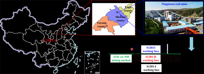2 Typical application of the N00 mining methodThe N00 mining method of the AFR with non-pillars has been successfully applied in the Ningtiaota coal mine, a shallow mine in western China, which is the first application in the world. The geographic location and roadway layout of the coal mine are shown in Fig. 3.